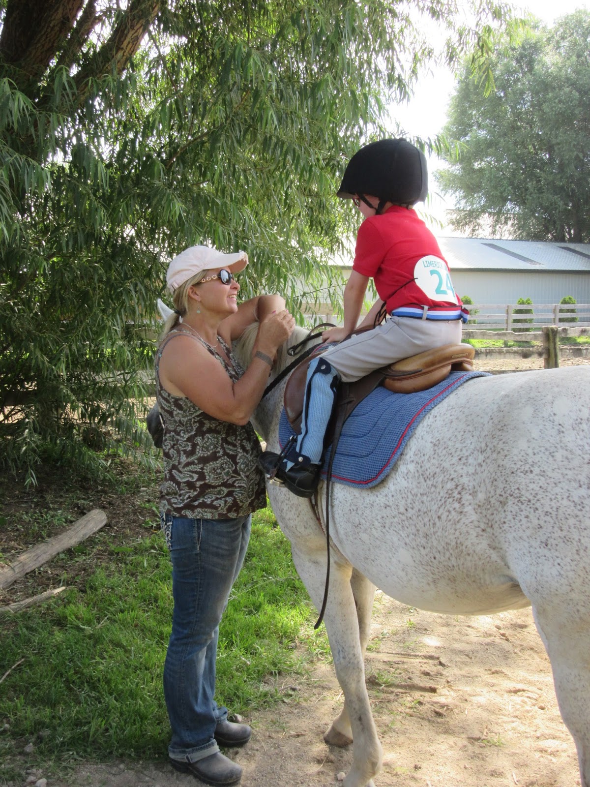 The kids were very excited to participate in their first barn show at Limerick Lane Farm where Kyrie has been taking riding lessons since November (and Degen began lessons this spring). This was our first barn show, so we weren't quite sure what to expect. We had a gorgeous, blue-sky day, and we got to the barn bright & early to tack our horses/ponies and prep for the day. Degen participated in 5 divisions, mostly by himself, but they really put him through his paces, testing his riding knowledge and his skills. He rode Dolly in lead-line, walk/trot and cross-pole divisions.